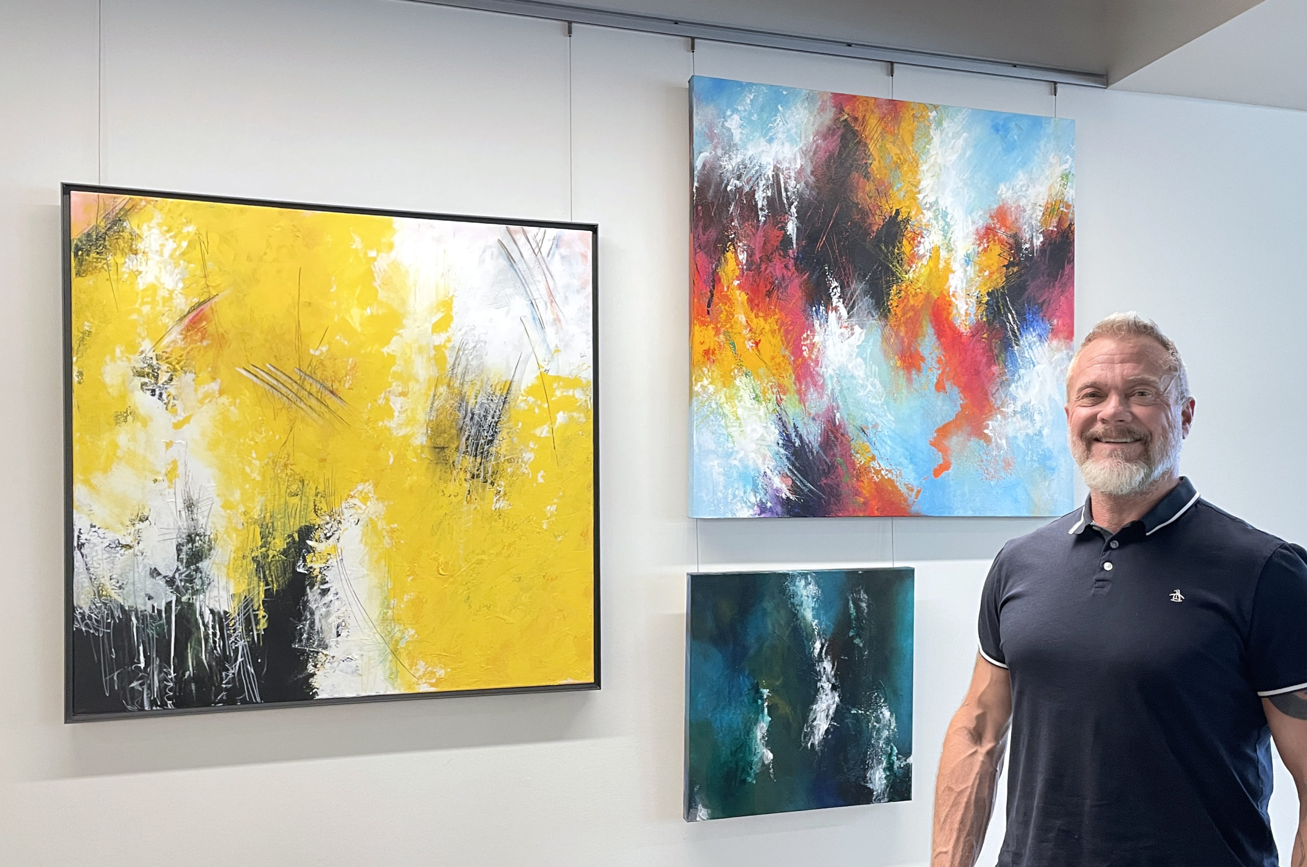 These bold, abstract compositions stand in contrast to the precision and logic of Mike’s professional design work. In his paintings, instinct and improvisation take the lead. “In my personal artistic pursuits,” he shares, “I’m free from rules and rational thought, allowing pure expression to flow.”