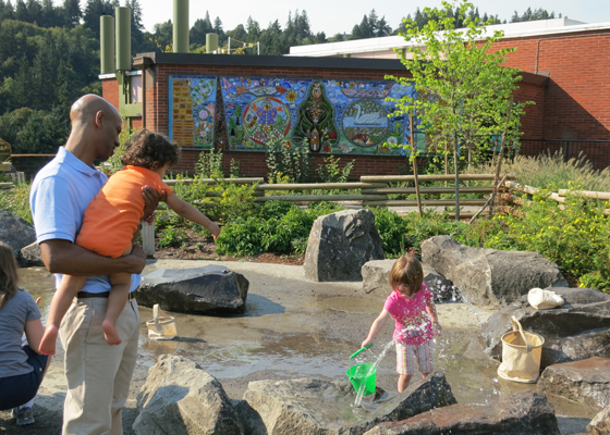 The Outdoor Adventure at the Portland Children’s Museum transforms a steep slope into an education-based, accessible environment where kids can be “wild in the city” and engage with the natural world. Working closely with museum researchers, teachers and exhibit staff, Mayer/Reed designed this innovative outdoor play space. The entry presents a low challenge, refined play garden that gradually gives way to dense tree canopy and vegetative thickets at the perimeter. Activities range from sand play and puddles to splash in to grassy mounds, dig pits, a giant climbing tree, and a rocky streambed with cascading water. “Big Mister Twister,” designed by artist Patrick Dougherty is a fanciful vine-maple sculpture emerging from the woods to offer the ultimate game of hide-and-seek. An amphitheater, campfire area and pavilion are venues for a number of programs and events.